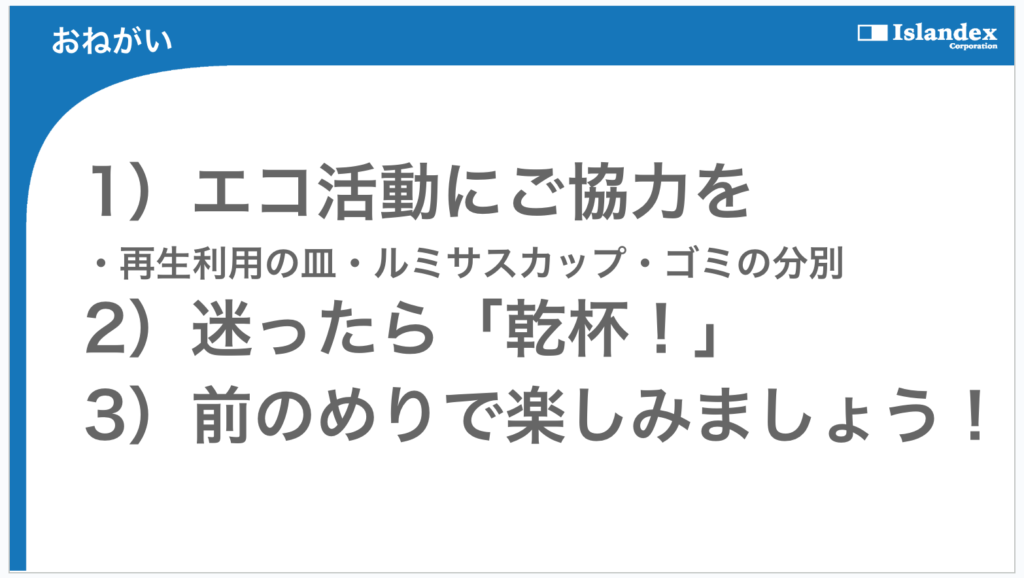 ファン感謝祭はただの飲み会じゃなく、当社の文化体感の場所としたいと思っております。そのため、当社がいつも社員で食事会をするときに共有している「おねがい」をご紹介させていただいております。特にふだんから大切にしているおねがいが「エコ活動にご協力を」という項目です。